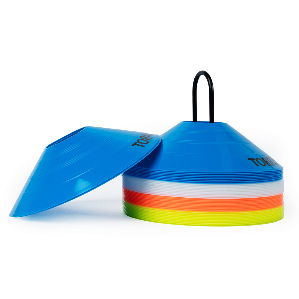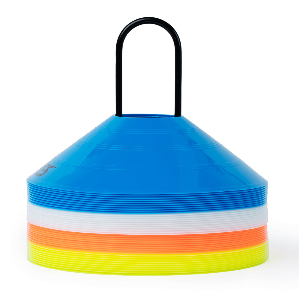 Фишки для разметки поля в виде усеченных конусов, мягкий пластик, комплект из 40 штук (синие, белые, оранжевые, желтые), высота 5 см, диаметр 19 см, на подставке без стопора. Индивидуальная упаковка - картонная белая коробка